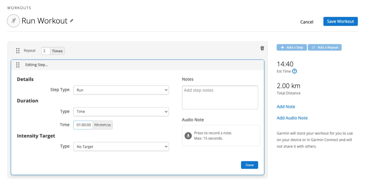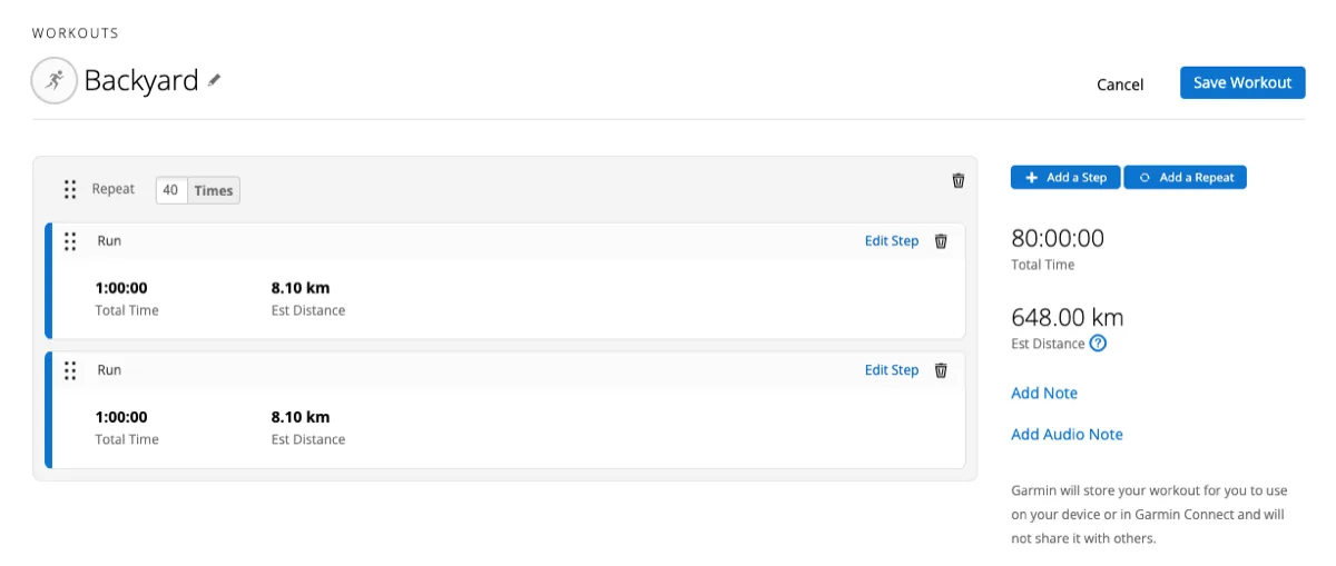 Pour le créer chez vous — direction l'appli Garmin Connect ou la version web, rubrique “Entraînement”, puis “Créer un entraînement”. Supprimez les suggestions par défaut, puis “Ajouter une répétition”.