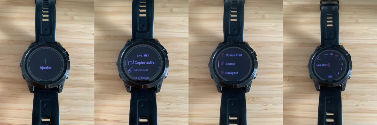 Pour créer cette activité : dans l'écran des activités de la montre, “Ajouter” → “Copier” → choisir “Course” (ou Trail) → lui donner un nom.