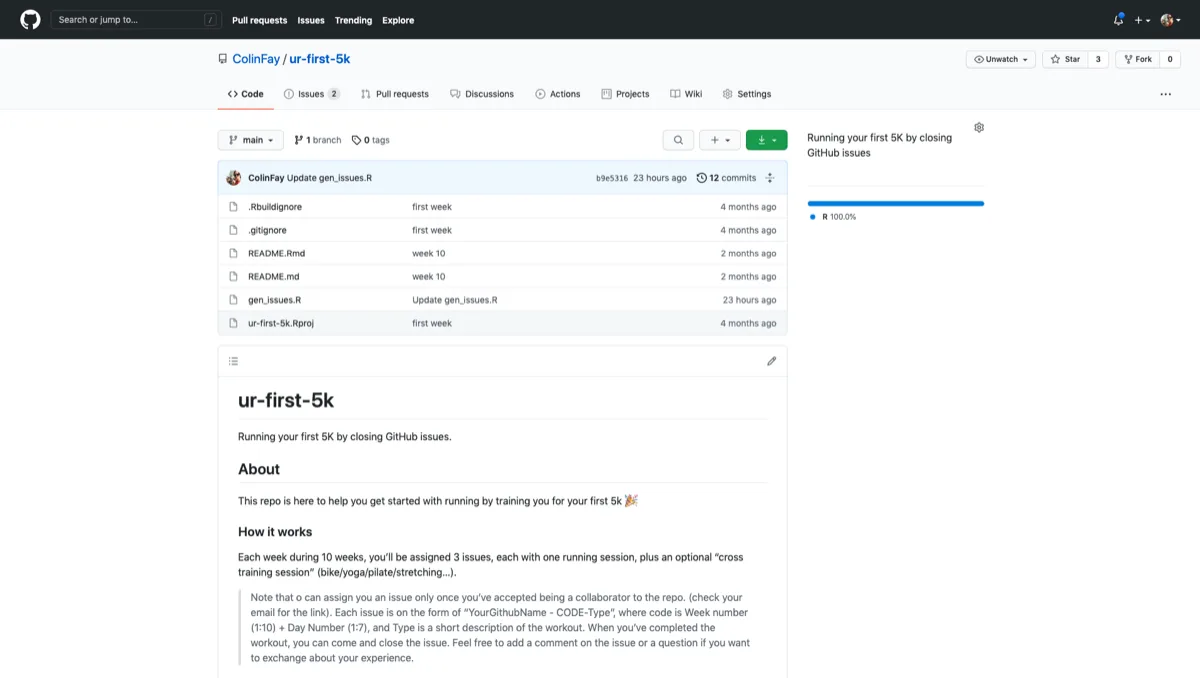 Le principe : chaque lundi, le script prendra la semaine courante du programme d'entrainement, bouclera sur la liste des participants, et ira ouvrir une série d'issues, assignant chacune des séances d'entrainements aux personnes concernées.