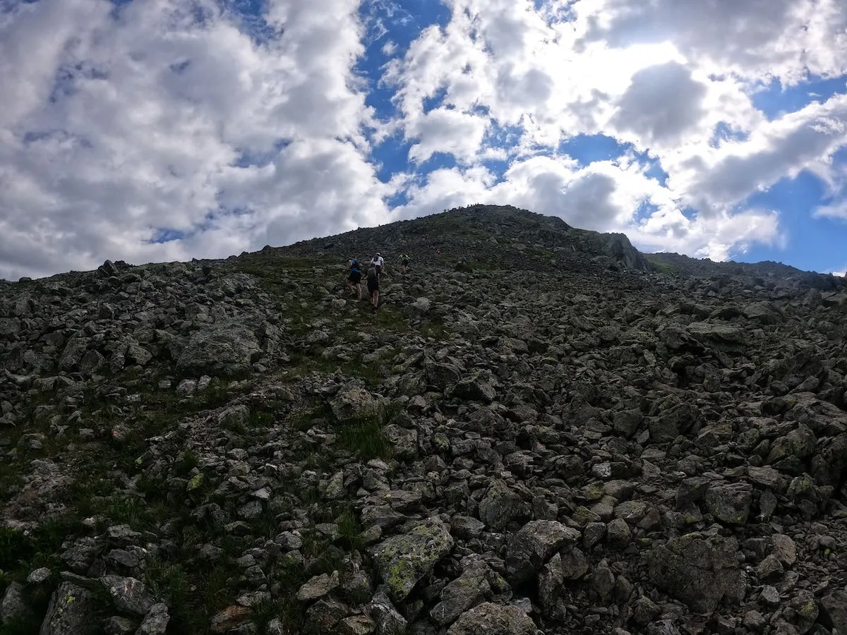 Le terrain est par contre un super terrain de jeu, et je suis content d'avoir choisi (même si par hasard) un KV qui monte sur de “vrais” terrains de trail, et pas sur une piste de ski. Au programme des 2.7 km : des chemins poussiéreux et remplis de pierres, des racines, des marches naturelles, et la course se termine dans un superbe pierrier qui nous coupe les jambes dans les 50 derniers mètres de D+.