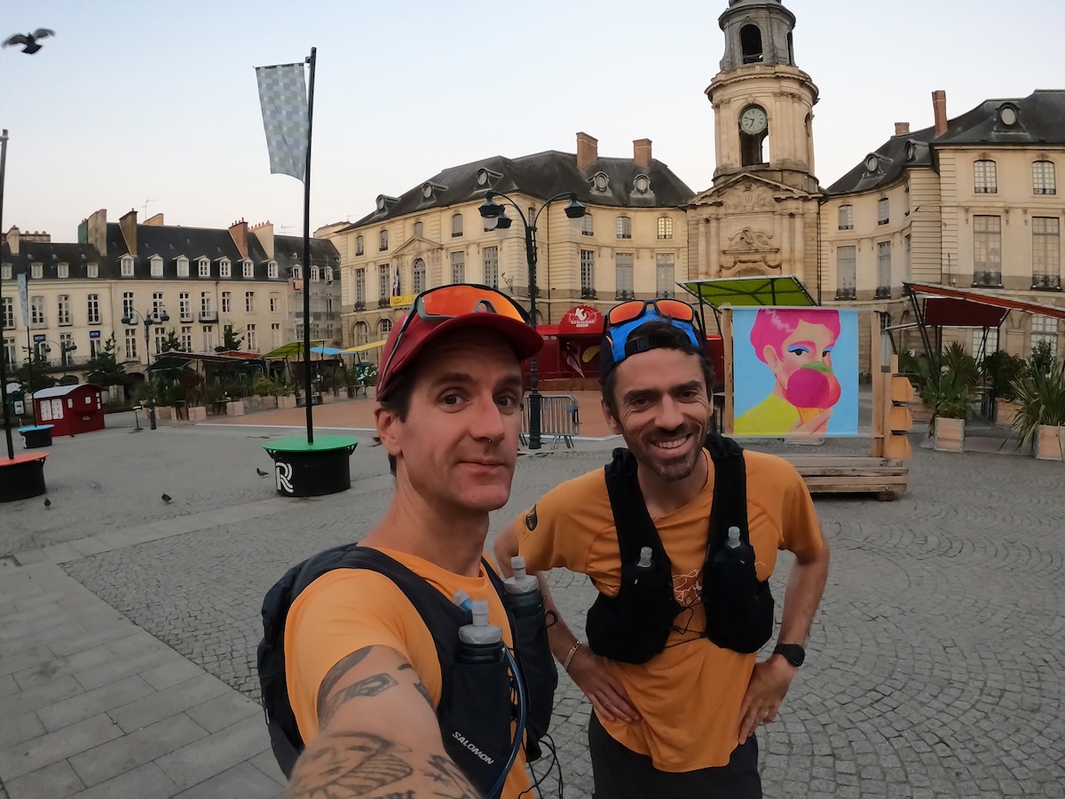 Rendez-vous avec Yves-Marie pour un départ à l'heure du lever du soleil : 07h01. Et parce que bien sûr, on est le 15 Août, pas de métro à cette heure là… On se fait déposer à la Mairie de Rennes en voiture, puis le temps de faire ses lacets et une photo, nous voilà partis direction le nord de Rennes. On passe par la Prairie Saint Martin qui dort encore, puis par les Gayeulles (que Yves-Marie connaît par cœur).