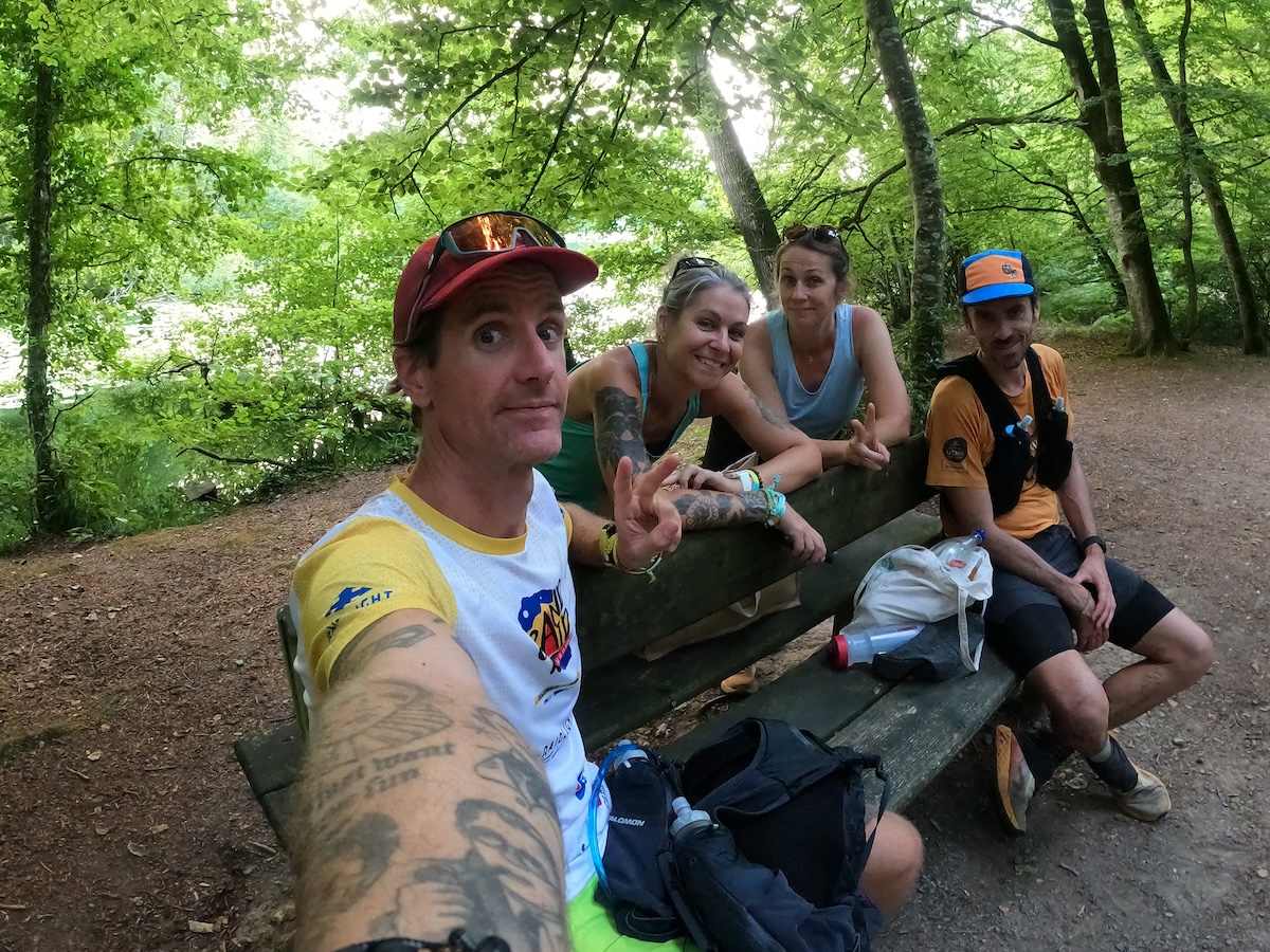 Je profite d'être à Antrain pour balancer quelques jeux de mots (pas le choix), on se tape la plus grosse côte du parcours, et on arrive dans la superbe forêt Domaniale de Villecartier. On doit rejoindre nos ravitailleuses près de l'étang, mais avant ça, on se perd dans la forêt. Coup de mou pour Yves-Marie, on est à quasi 80 bornes, je me dis que ça sera mon tour dans pas longtemps (spoiler : oui, c'est pour bientôt).