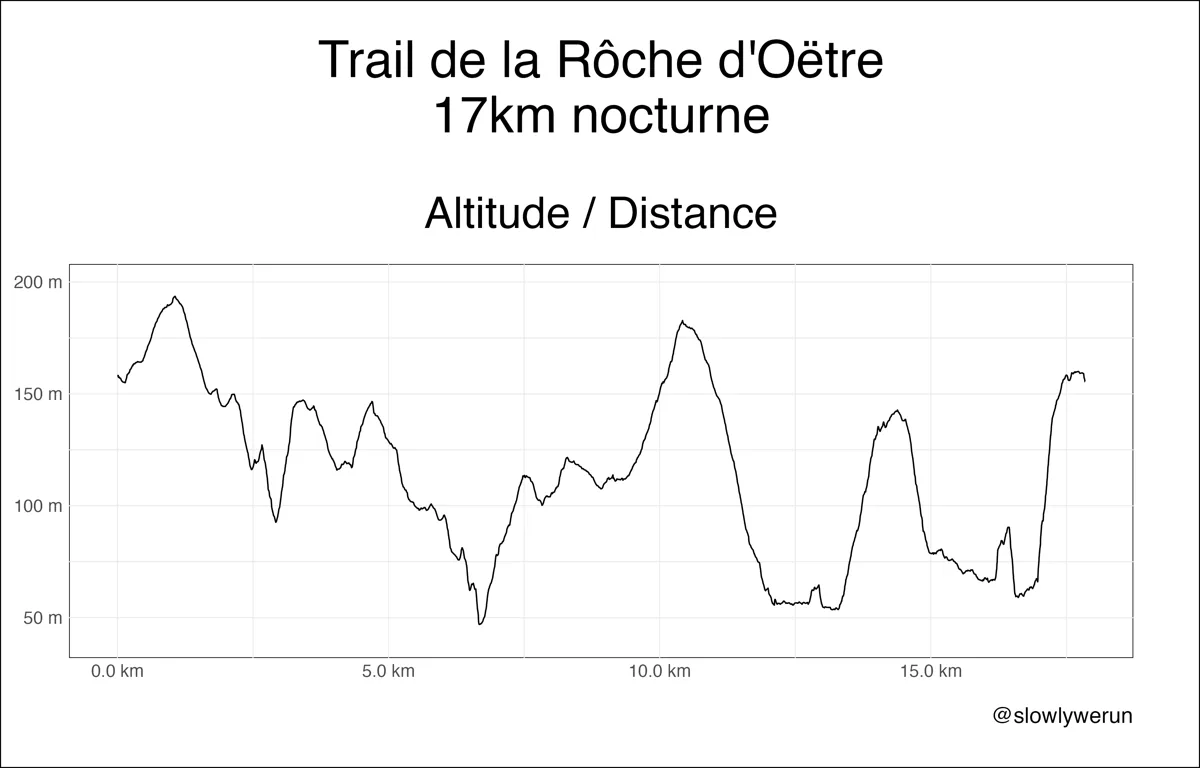 Côté terrain, on s'amuse à travers chemins de randonnée, bord de Rouvre (la rivière locale), et quelques montées casse-jambes qui font le plaisir des traileurs engagés sur ce 17km nocturne. Et le D+ n'est pas non plus négligeable : la montre affiche 525m de dénivelé, et quand on se rappelle que le plus bas point est à 47m et le plus haut à 193, on se rend bien compte qu'on n'a pas chaumé.