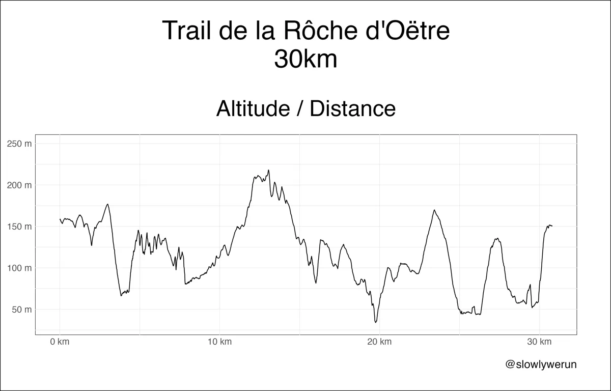 Un profil différent d'une course bretonne comme le trail des Légendes de Brocéliande, qui lui va afficher de beaucoup plus nombreuses oscillations — et c'est normal, quand l'amplitude est entre 40 et 120 m d'altitude, ça laisse moins de place pour les longues montées / descentes. Ici, à la Roche d'Oëtre, on se balade entre 30 et 220m, ce qui laisse un peu plus de place à l'ascension. Même si effectivement, on est encore loin des courses en montagne.