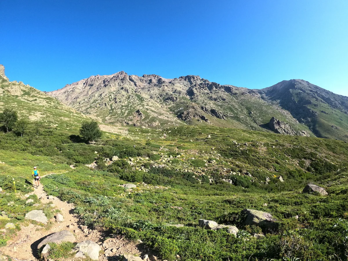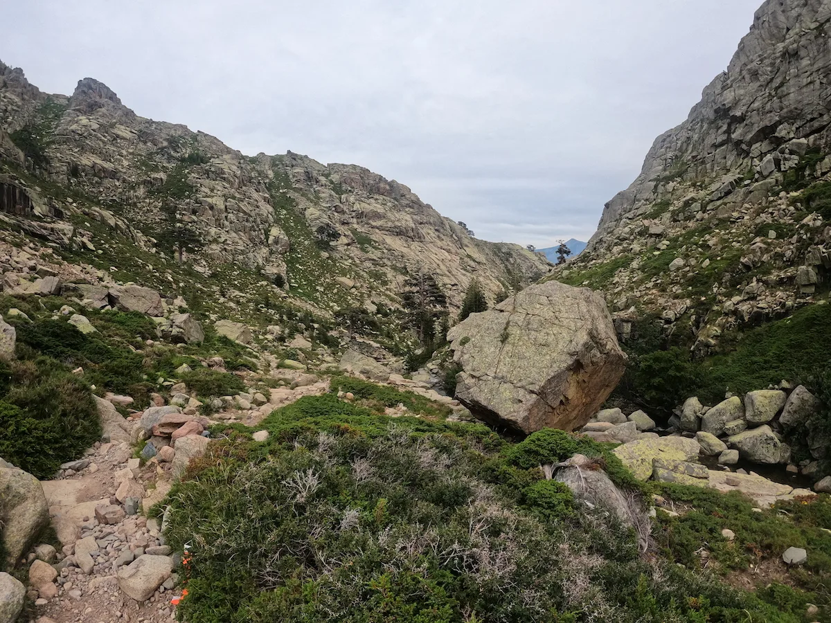 Je profite quelques instants, et j’entame la descente. Sur le papier, une portion cool. En pratique, toujours la même rengaine : impossible de mettre un pied devant l’autre sans avoir des appuis qui partent en vrille à cause des cailloux. Pas trop le temps de regarder le paysage, par contre je connais mes pieds par cœur. La fin d’après midi est douce et je rejoins Vergio, où m’attend mon sac d’allègement.