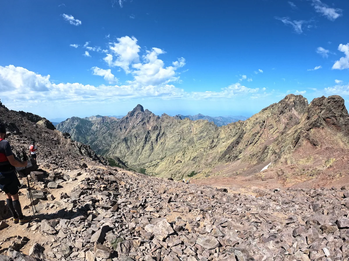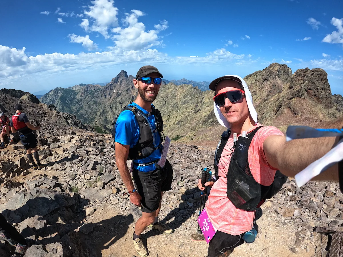 On a mis plus de 4h30 à monter, et nous voilà sur le point culminant de la course (2415m), et sur le GR20. Arrivé en haut, je glane un verre d’eau aux bénévoles. « Désolé, pas de vrai ravito, on a tout monté en âne déjà ! » On profite quelques secondes de la vue, on prend un selfie… et go pour redescendre.