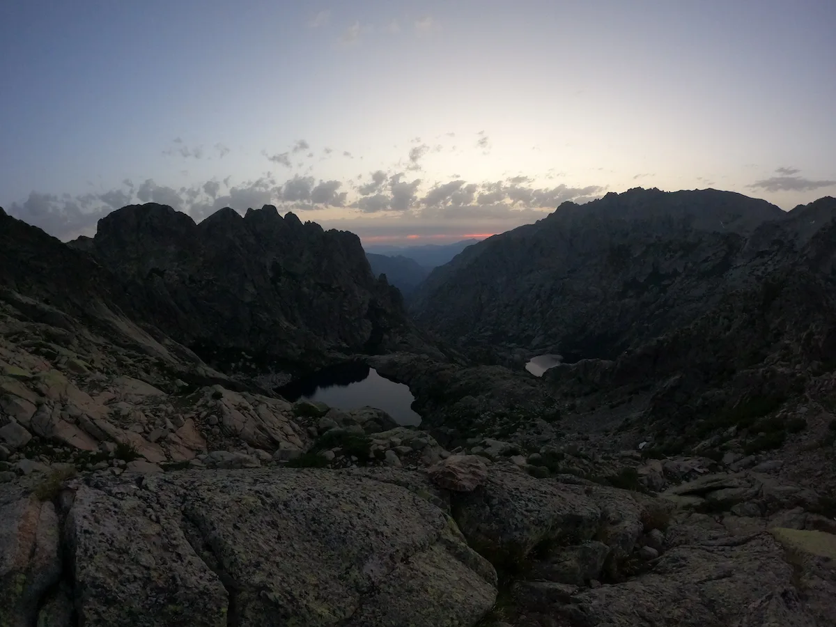 On arrive en haut au levé du jour. La vue sur les lacs, au milieu des pierriers, est magnifique. Elle aussi, elle se mérite.